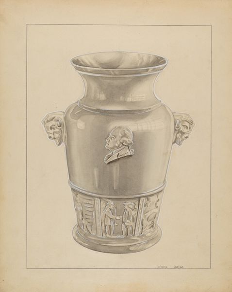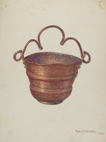 Editor: So, here we have John Fisk's "Wall Pocket for Flowers," a drawing and watercolor piece from around 1936. I'm immediately drawn to the earthy tones – they give it a sense of warmth, like a forgotten relic. What stands out to you most in this piece? Curator: It’s got that 'make-do-and-mend' spirit, doesn't it? It feels incredibly personal, a gentle nod to a time when everyday objects were lovingly handmade and cherished. It whispers of cozy kitchens and fragrant blooms picked from the garden. It almost feels like a vessel for memories. Editor: I see what you mean! It feels both practical and a bit whimsical. It's a drawing, so it's one step removed from being an actual wall pocket. Was this sort of decorative art common in the 30s? Curator: Absolutely. During the depression era, there was a real focus on handmade goods and a nostalgic longing for simpler times, the comfort of home. People found ways to beautify their surroundings with what they had and these design drawings were like dreams of domestic possibility. Editor: It’s amazing how much history is packed into such a simple image. Do you think Fisk intended to evoke these feelings of nostalgia? Curator: Perhaps, perhaps not. But as viewers, we bring our own baggage, right? The browns and greens make me think of my grandma’s pottery, the textures I remember are amplified here. Art's a conversation, you see, and Fisk started it with a wall pocket! What new story will you weave with this picture? Editor: That's a beautiful thought, I never considered this before. I like how we can all project our own story into art.