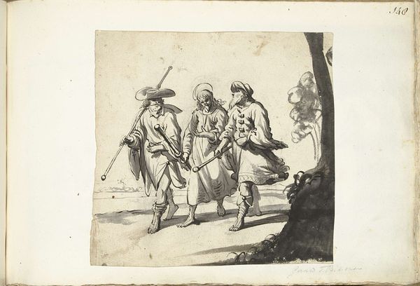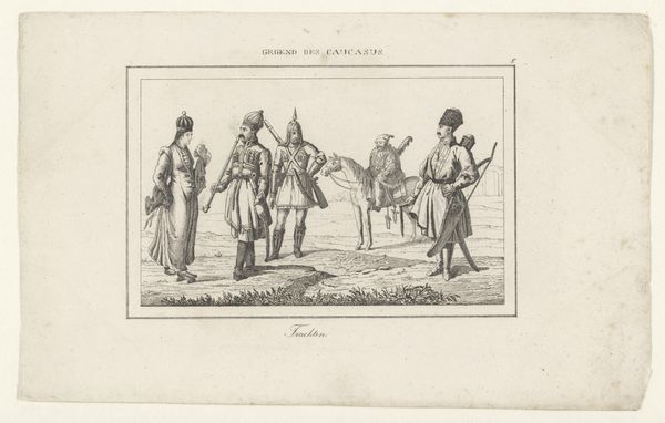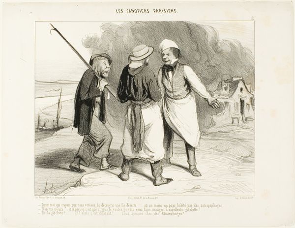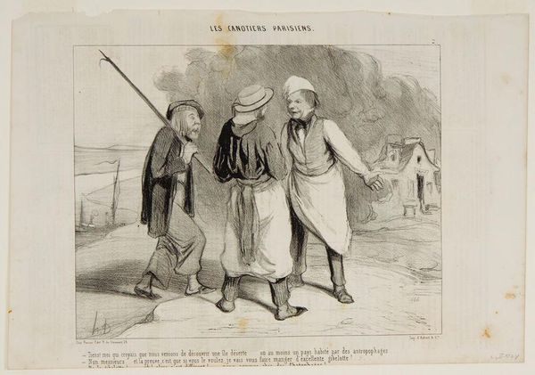 Curator: This lithograph by Honoré Daumier, created in 1843, is titled “- All right Rigobert, my old friend.... we are going to make a long trip today.... did you bring enough provisions on board of our vessel? - Don't talk about it.... all I was able to bring along are two biscuits and a red herring,” plate 1 from *Les Canotiers Parisiens*, currently residing here at the Art Institute of Chicago. Its graphic presentation lends a quirky charm. Editor: The exaggerated features of the figures – the long face and spindly legs of the speaker, and the slightly lumpen other figure - evoke a peculiar comic quality. The texture of the lithograph creates a lovely visual interplay. Curator: The artist's use of lithography allowed for mass production, making it available to a broad audience. One might explore the context in which Daumier created these. What commentary was Daumier making about Parisian society through the lens of these boatmen? Is he emphasizing a difference between the high-minded Romantic artistic styles and the means of material creation? Editor: Daumier certainly seems invested in the realities of production here. Look at the emphasis on line and form, it is not exactly precise rendering. In a broader context, one could analyze the paper and ink used in the production of the prints. Also, considering that prints were circulated broadly in newspapers and as separate broadsides is key. Were such works ever seen as 'high' art? Curator: The text provides a glimpse into their socio-economic realities: a meagre ration of "two biscuits and a red herring." Consider that prints, and indeed this image, became accessible objects for many working Parisians. Editor: Considering Daumier's frequent depictions of the struggles of the working class, it seems right to say that there is definitely an aspect of material sympathy here. The work isn't sentimental exactly, but nor is it unconcerned. The focus on printing and on reproducing images has a democratization embedded inside it. Curator: His visual vocabulary is accessible yet nuanced, a clever means of engaging a wide range of viewers in the social narratives of his time. I am inclined to spend some more time with Daumier, here. Editor: Indeed, it offers an entry point into considering not just the subjects represented, but how their image itself became part of the culture, consumed alongside the meager fare the depicted figures can afford.