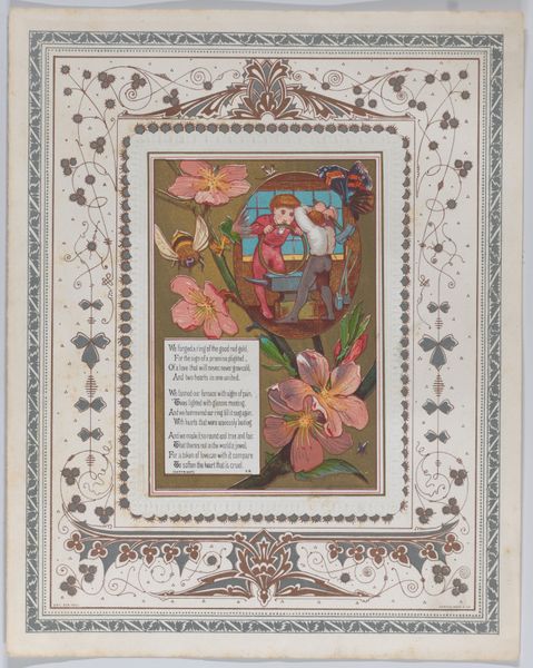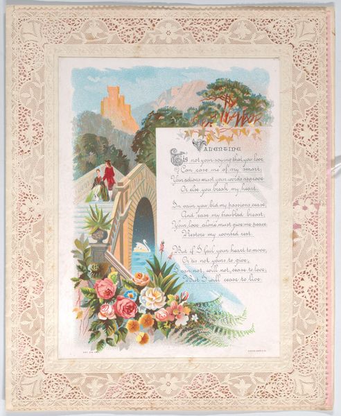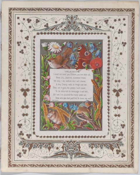 This "Valentine" card was made by Kate Greenaway. We are presented with symbols of love and nature, combined in a curious way. The poem speaks of a bird and a flower, acting as messengers of love, but the true focus here lies in the visual language. The flowers, rendered with soft, pastel hues, evoke feelings of tenderness, but also resonate with the ancient motif of the "language of flowers," where each bloom carries a specific meaning. Think back to classical depictions of Flora, the Roman goddess of flowers, whose image is linked to beauty and rebirth. In the lower cartouche we see a gallant handing what seems to be a letter to a kneeling lady. This gesture is reminiscent of medieval courtly love, a symbol of devotion and longing. Yet, there’s also a hint of melancholy, as the poem touches upon the idea of fading beauty. This duality—the joyful and the sorrowful— engages us on a deeper, subconscious level, reflecting the complex nature of love. This card reminds us that symbols never truly disappear; they resurface, evolve, and take on new meanings, echoing through time.