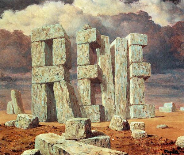 René Magritte painted The Legend of the Centuries using oil on canvas. Magritte employed conventional art materials to create a striking image, playing on scale and juxtaposition. The painting features a massive stone chair, reminiscent of ancient megalithic structures, dominating a beach landscape. Perched atop this monolithic seat is a small, wooden chair, creating a surreal contrast. The making of this artwork lies in Magritte's careful brushwork, building the textures of stone and wood. The massive stone chair suggests permanence and power, while the small wooden chair hints at domesticity and individual comfort. This striking contrast prompts thoughts about labor, class, and consumption. The sheer scale of the stone chair implies immense effort, while the smaller chair, easily crafted, speaks to everyday life. Through his deliberate use of materials and composition, Magritte challenges our understanding of scale and the social constructs we take for granted.