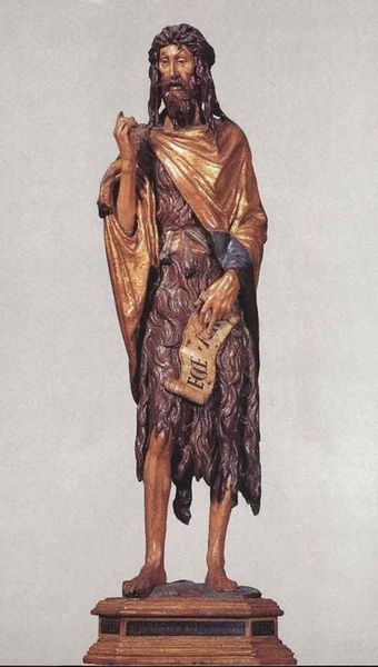 Curator: Immediately striking, wouldn't you say? He almost seems to be delivering a rather impassioned sermon. Editor: Yes! Or maybe conducting a baroque symphony with just that one expressive hand. But there’s also something unnerving... a stark intensity in his gaze. Curator: Quite right. What you're perceiving there is beautifully captured in this wood sculpture by Johann Georg Pinzel, titled "Saint Francis Borgia," crafted in 1753. Notice the dramatic gesture, very typical of Baroque sculpture, pushing the boundaries of emotional expression. Editor: Wood, you say? I assumed some kind of terracotta from the tone... But the medium adds another layer – this almost visceral quality. Each mark seems imbued with Pinzel's urgency. Is that accurate or am I projecting? Curator: That's a very interesting interpretation. Formally speaking, observe the dramatic diagonals achieved, most notably his outreaching gesture balanced against the counter curve of his body. Pinzel masterfully employs texture and form to imbue the figure with dynamism. It’s certainly not calm contemplation, but the articulation of divine fervor. Editor: Absolutely, dynamism is key. I think it's less serene divinity, though, and more humanity – almost raw vulnerability carved into being. I mean, his robes could smother him at any moment! And isn't his gaze subtly accusatory? What does Pinzel make us question in our relationship with the saint, the divine, even ourselves? Curator: Ah, that’s the baroque paradox, the synthesis of drama and faith! It seeks to involve us. Now, what remains implicit, to my eye, are the specific symbolic attributes omitted... Editor: Symbols? Oh right, you mean like a skull... perhaps Pinzel was aiming for direct pathos over narrative crutches? A universal human unease about our frail existence? Maybe Saint Francis is a reflection, and those fine robes and titles are a shroud. Curator: I like that notion, certainly adds more flavor to your original unease. Editor: Indeed. It’s a rare gift when centuries later art holds the mirror up, but I suppose such talent is a sort of transubstantiation.