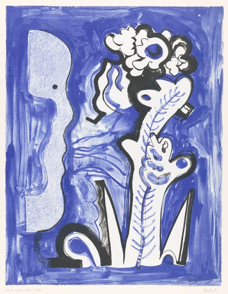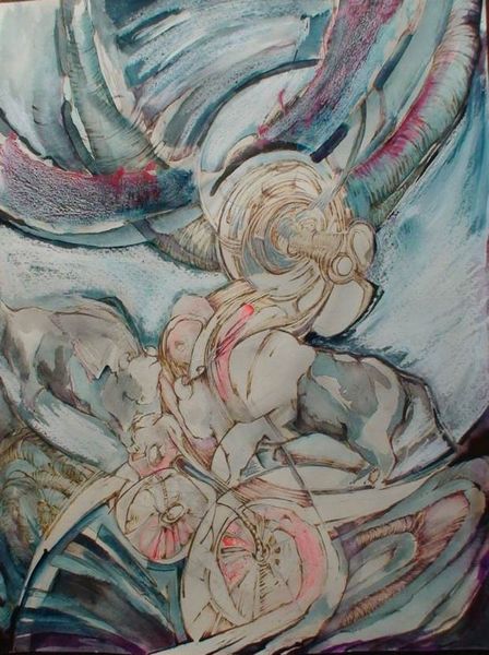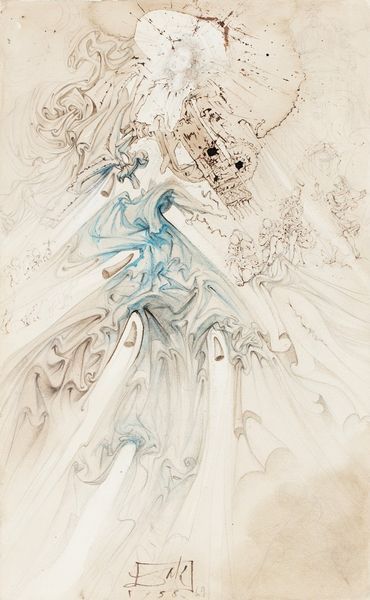 Curator: Here we have James Jean’s 2015 watercolor drawing, "Mockingbird." Editor: The monochromatic palette is immediately striking. A melancholic, dreamlike mood permeates the piece. Is it intended to be unsettling, this figure adorned, almost overwhelmed, by birds? Curator: It's intriguing how Jean employs such precise linework within a fluid watercolor medium. Notice the patterns on the kimono; they provide a stark contrast to the texture of the birds’ feathers, creating visual depth. The composition adheres to a subtle symmetry that adds to its formal elegance, and that cloud or spill around the figure's foot adds such a perfect grounding of etherealness to reality. Editor: Indeed. And that kimono pattern itself, laden with stylized floral and avian motifs, directly links the figure to themes of nature and transformation. In many Eastern traditions, birds are seen as messengers, connecting the earthly and spiritual realms. Could the cluster of birds obscuring the figure’s head symbolize a loss of self, or perhaps a transcendence? Curator: Perhaps it's a meditation on liminality. The semiotic weight of the birds combined with the human form creates a dialogue. Do the birds obscure the subject’s identity or amplify some facet of the self? Editor: Precisely, we can also interpret it as a depiction of the creative spirit; the birds symbolizing inspiration, constantly swarming and influencing the artist's thoughts and actions. It touches upon themes of freedom and constraint simultaneously. Curator: The stark blue watercolor unifies those themes of identity, self-expression, and naturalism to suggest a state of serene pensiveness. Jean’s skillful handling of line and form results in a visually compelling and intellectually stimulating composition. Editor: Ultimately, this piece reflects the artist’s inner landscape – the confluence of tradition, personal symbolism, and imaginative storytelling rendered in a visually captivating form.