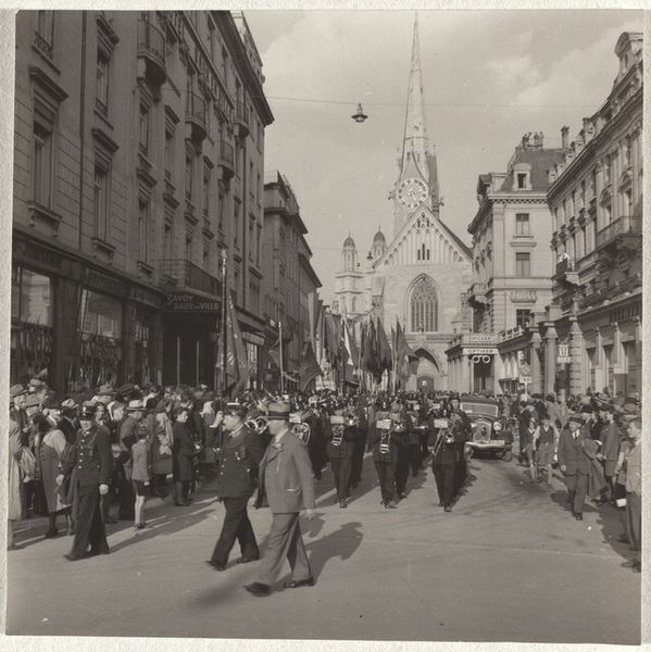 Robert Frank made this gelatin silver print, "Streetcar--Transportation," sometime in the mid-20th century. It captures a street scene likely in Europe, perhaps Frank's native Switzerland, and presents an interesting juxtaposition of the modern and the traditional. Notice how the streetcar and motorcar represent the rise of modern urban transport. They contrast with the looming church, a symbol of enduring social institutions. The blurred figures suggest the anonymity and transience of city life. The Savoy Hotel indicates a certain level of commerce. Frank's photo can be better understood by consulting archives of mid-century urban planning, church records, and hotel registries. We can reflect on how these institutions shaped everyday experience. What was their impact on social class and the way people went about their lives? Was Frank, as a photographer, making any kind of intervention into the social structure? The image demonstrates how even seemingly simple photographs can serve as documents for social and cultural historians.