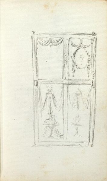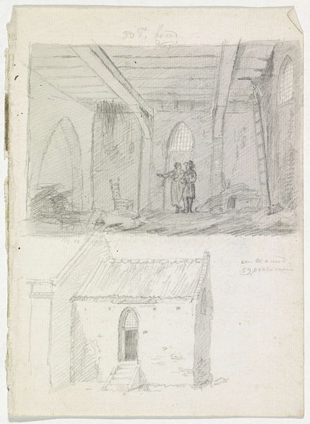 Curator: What strikes me about this sketchbook page by Gabriel Jacques de Saint-Aubin, housed here at the Harvard Art Museums, is how fleeting it feels, like a captured thought. Editor: Fleeting is right. It’s all soft edges and a kind of haunting gray scale, like a memory fading at the edges. Two studies here, one above the other, both hinting at grandeur. Curator: The upper sketch depicts an architectural interior, maybe a church, with soaring columns and a domed ceiling. The lower one seems to capture a bridge, perhaps over the Seine. Editor: There is an ethereal quality in both, achieved through the artist's light touch. Look at the way Saint-Aubin suggests form with minimal lines, it really is captivating. Curator: It's interesting how these sketches, though unfinished, convey a sense of depth and atmosphere. Editor: Absolutely. They feel like glimpses, and that incomplete nature is part of their allure. They invite our imagination to fill in the blanks, don’t they?
