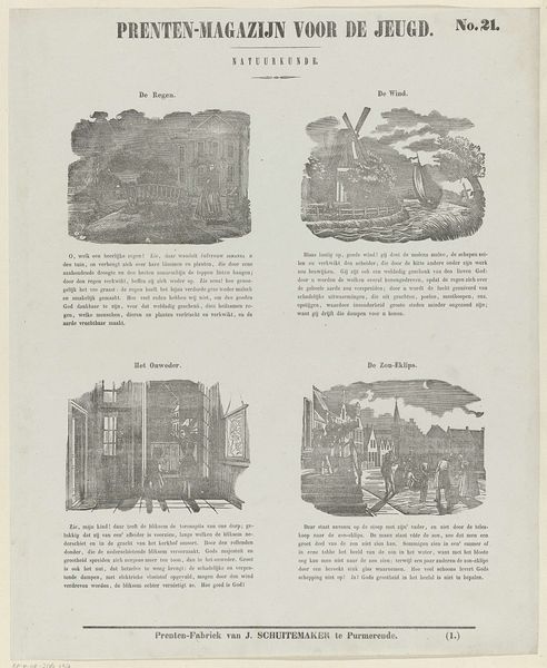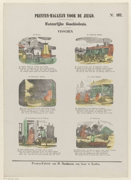 Editor: So, this print is called "Koopman, Zeeman, Soldaat en Boer," which translates to "Merchant, Sailor, Soldier, and Farmer." It's from 1850, by Jan Schuitemaker, done as a lithograph. It has an old-world feeling, almost like illustrations from a storybook. The depictions seem very stereotypical of those occupations. How would you interpret these scenes? Curator: Oh, this reminds me of those little Dutch scenes painted on tiles… There's a comforting charm in its simplicity, wouldn't you agree? But look closer. Each scene, while seemingly generic, it presents an archetype and is a reflection of the Dutch societal fabric. There's the entrepreneur "Koopman" busy at commerce, the "Zeeman" representing exploration and connection to far away shores, the protector represented by the "Soldaat", and sustenance and labor embodied by the "Boer" – it’s almost allegorical, isn’t it? Almost like little parables. What do you think about that? Editor: I see your point. Each of them represent cornerstones of society. They also serve as reminder of the different levels in the Dutch societal structure, and almost like a story of societal functions that complement each other. Curator: Precisely! Schuitemaker has captured the essence of everyday life with a hint of idealisation, if you ask me. I think we're not far off imagining our society shown with a similar set of principles as they where envisioned then, only changed by modernity! Editor: Absolutely. This print provides a lovely glimpse into the past. I guess, things aren’t so different today. Curator: We would not exist if not for all four of those people to thrive in harmony! Thanks, Schuitemaker!