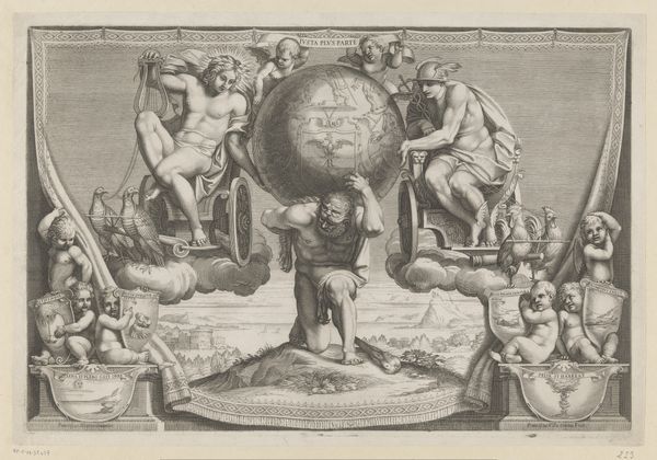 This engraving, "Wereldbol omringd door figuren uit verschillende werelddelen" was created by Jean Picart, using line engraving. The composition is split into two distinct halves, and the surface of the print is a complex interplay of finely etched lines that create a range of tones and textures. Visually, the globe becomes a focal point, positioned centrally and surrounded by figures that embody the continents. The sun, the rainbow, and the Hebrew inscription above the globe are not merely decorative, but serve as structural elements. Here the artist uses semiotics to imbue the image with cultural meanings. The figures are meticulously rendered, and through costume and posture, Picart encodes a hierarchy of power, destabilising the perceived order of the world and questioning the dominant narratives of the time. The print functions as an intellectual map, inviting reflection on the era's global consciousness and the dynamics of intercultural exchange.