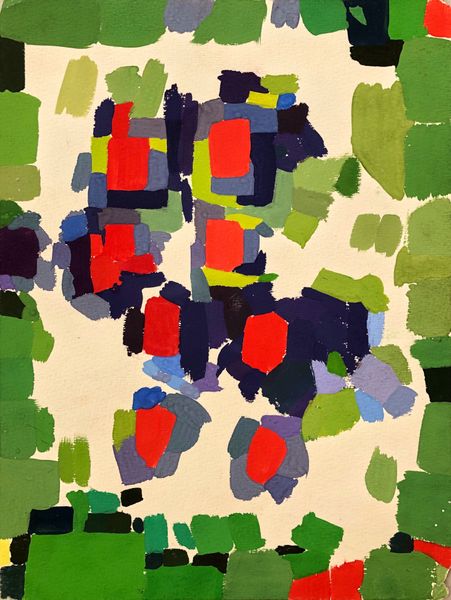 Curator: Stepping back to appreciate this compelling 1963 artwork by Hryhorii Havrylenko, titled "Composition," executed with acrylic paint. It's held in a Private Collection. What is your immediate reaction to this particular abstract piece? Editor: A puzzle! Or perhaps an aerial view of fragmented fields, if fields were coloured in blues, greys, greens, and jolted by dashes of vibrant red. There's a deliberate structure but a playful disruption, making me think about hidden symbolic meanings within the colour choices. Curator: Considering the historical setting in 1963, Havrylenko would have been creating within the rise of Abstract Expressionism, though perhaps with his own unique, regional inflection, given its provenance outside Western Europe and North America. Can we see echoes of the art world's geopolitical shifts in how abstraction was embraced differently across contexts? Editor: Absolutely, abstract forms provided a universal visual language. Notice the almost childlike forms, not simple, but familiar, as if we are all accessing a collective memory through geometry and bold primary hues. Red as passion? Red as a warning sign? The juxtaposition creates narrative possibilities. Curator: And thinking about the context of artistic expression, Havrylenko's choice of acrylic, rather than traditional oils, could have signaled a modernizing force, influenced by broader cultural shifts toward mass production and consumer culture within the art world. Was he positioning himself as part of an artistic avant-garde? Editor: Precisely! By abandoning identifiable imagery, "Composition" becomes a sign in itself— a symbol pointing towards a collective desire to break from prescribed societal molds and to question norms. I wonder how contemporaries saw these choices, particularly in light of Cold War tensions. Were abstract shapes coded critiques? Curator: It highlights how the social climate can penetrate the most "abstract" aesthetic decisions, turning art into silent dialogues with power. A fascinating piece to analyze the intersections of political consciousness and abstract art movements. Editor: Yes, leaving us to decode these fields of color for hidden cultural messages, reminding us of the ever-present interplay between artistic intent and how we interpret. A dense and multilayered piece, despite its deceptive visual simplicity.