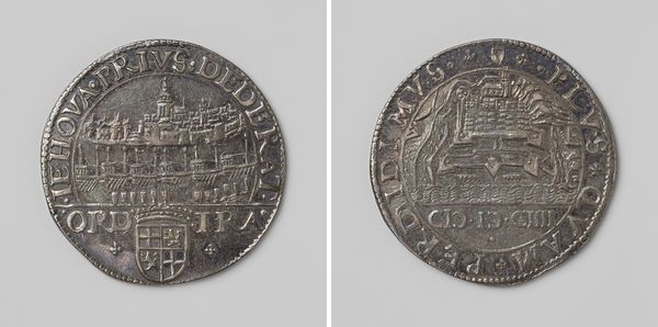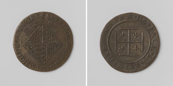Editor: We’re looking at a bronze medal made in 1603 by an unknown artist. It's titled, “Maurits, graaf van Nassau, breekt het beleg van 's-Hertogenbosch af, rekenpenning ter ere van Albrecht en Isabella van Oostenrijk.” It’s really hard to see what's going on. The relief is quite worn. What do you see in this little window into the past? Curator: It's funny you call it a window, because I see it as more of a pebble— something that has been tumbled by the currents of history until all the sharp edges are worn smooth, just like the faces of those historical figures. This piece seems less about celebrating victory and more about remembering a moment, a shift in power, perhaps. Editor: A shift in power? How so? I mainly see those faded shields. Curator: Exactly! Think about those shields. Each one meticulously crafted with its own unique heraldry. To me, that symbolizes the various factions and families involved in this siege. Even in its worn state, it whispers about the complex political tapestry of the time. Don’t you think it is ironic that such an object made in bronze intended to immortalize this moment in fact makes one aware of its decay with time? What do you feel about it? Editor: You are so right. I think I get so caught up in looking for grand artistic statements I miss the more human moments frozen in everyday objects. It shows how political power shifts and history decays, turning grand narratives into…pebbles, as you said. Thank you for the…re-framing. Curator: I’m still learning to listen. Maybe it's also saying, "Even grand narratives turn to dust, so appreciate the whisper while it lasts." Food for thought, I suppose.
