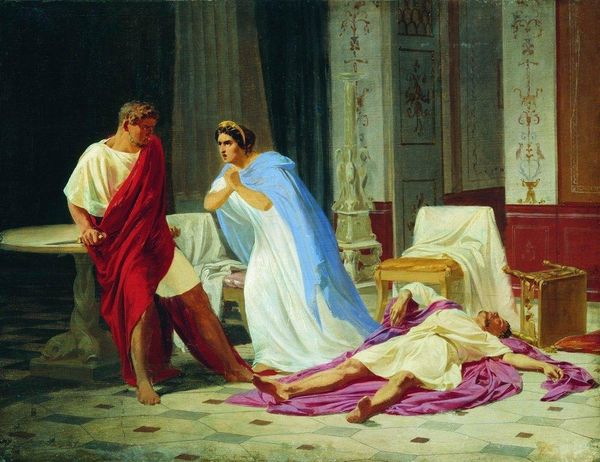 Curator: The scene depicted here, by Henryk Siemiradzki, painted in 1870, is entitled *Alexander of Macedon Trust's the Doctor Philip*. Oil on canvas, its a wonderful example of academic art depicting a historical moment. Editor: It's definitely impressive, technically. My immediate sense is that this painting seems oddly...static. Like a carefully staged tableau vivant. Everyone is very posed. Curator: Interesting. As an academic work, its fabrication, as in the materials, the way Siemiradzki manufactured a historical event on canvas using oil paints and academic methodology, would’ve required rigorous study, preliminary sketches, and careful selection of materials. Consider the social context: the rising interest in historical and classical themes in the 19th century, which fueled the market for this type of work. The making of historical narratives was also deeply tied to issues of nationalism and imperialism at that time. Editor: Exactly. Think about what it means to present Alexander as this almost fragile figure. The vulnerability, the evident reliance on the wisdom of the educated older man, could have spoken volumes to late 19th century anxieties surrounding leadership and the maintenance of empires at a time when colonial projects faced growing scrutiny. Curator: Well, even the costumes would have been painstakingly researched and probably made to order, involving a range of artisans. Also, a tiger skin bedspread—consider the complex symbolism surrounding Alexander's conquests and the labor involved to create this single detail in the painting. It reinforces his identity as a great conqueror. Editor: And what does that mean for us, as viewers, consuming this image now? Who gets to claim Alexander as their ancestor, and who is written out of this carefully constructed history? Siemiradzki created this idealized vision of power, embedded in materials, and reinforces specific ideas. I question whom this history truly serves and empowers. Curator: Ultimately, analyzing the painting through a materialist lens, we find it encapsulates the artistry of creating such historical paintings during this period, making us wonder about its cultural relevance when created. Editor: For me, seeing *Alexander of Macedon Trusts the Doctor Philip*, as more than just brushstrokes and pigments, is realizing its constructed story, urging us to think about which stories we're asked to believe.