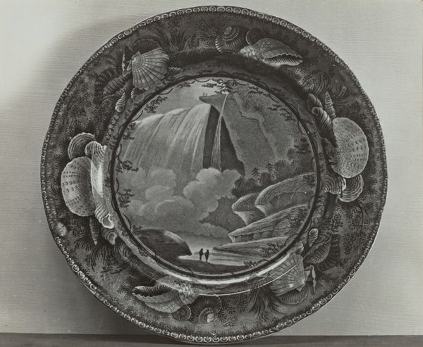Curator: This piece is a transfer-printed earthenware plate, dating to around 1936. It's titled "Baltimore and Ohio Railroad." Editor: It feels immediately…nostalgic, almost in a bittersweet way. Like peering into a faded photograph album of someone else’s memories. The monochrome palette enhances that feeling of a distant past. Curator: Transfer printing was popular for mass-producing ceramics with detailed imagery. This particular design uses a genre scene to romanticize industrial progress, depicting an early train against a pastoral landscape. It really taps into the mythology of westward expansion and technological innovation. Editor: The central image, contained in that clean circle, offers a contrasting feeling from the decoration around the edge. Look closely, there's flora, fauna and these scallop shell cartouches. That strange combination hints at the ocean trade of the company in question. Almost a maritime memory, like a sailor bringing tales from abroad. Curator: Precisely! The shells point to international commerce, suggesting access to exotic resources—this plate becomes not just a souvenir, but a statement about the railroad's global reach and influence. Consider, too, how the train becomes a symbol of connection, overcoming geographical boundaries. It compresses time and space in the image. Editor: So, it's not simply a pretty plate, but a multilayered emblem of ambition and transformation? I mean, I still find that mix of pastoral ideal and industrial machine jarring, though! Does that speak to any contemporary anxieties of that period? Curator: The 1930s saw growing pains with rapid urbanization and economic shifts during the Depression. That juxtaposition might be highlighting both pride in progress and perhaps an undercurrent of unease at the changing world—an elegiac note, certainly, amidst all the technological triumph. Editor: I'm now looking again at this and imagining folks eating their dinners off a monument to industry... or dreaming of somewhere far away, spurred on by those shell-like forms. It’s a curious marriage of the domestic and the monumental, I would never expect it. Curator: The intimacy of the object—the plate, designed for daily use—amplifies its symbolic weight, doesn’t it? The railroad company hoped to bring a sense of expansion into every home, I guess, but this can show so much more than it tried to tell... Editor: Exactly, sometimes it's more rewarding to not tell a direct story, in a very clever and artistic way. That’s something worth dwelling on as we wander around the gallery, right?