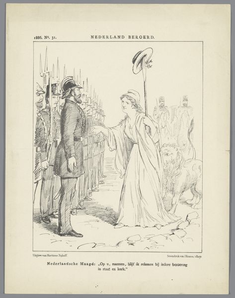 This 1875 print by Johan Michaël Schmidt Crans offers a satirical view of Dutch involvement in South African railway construction. The cartoon highlights the complex relationship between the Netherlands and South Africa during the late 19th century, particularly the economic and political dimensions of colonialism. The image creates meaning through its allegorical figures and symbolic elements. The Dutch maiden offers a diminutive Dutchman to the president, presumably of the South African Republic. The railroads and factories in the background, juxtaposed with the Dutchman’s small stature, suggest both ambition and the potential for exploitation. The inclusion of a globe hints at broader colonial ambitions. In the context of increasing European control over Africa, the print critiques the motivations and consequences of Dutch investment in South African infrastructure. To fully understand this artwork, one might consult historical archives and economic reports from the period. Such research helps us understand the social conditions that shaped artistic production. The meaning of art is contingent on social and institutional context.