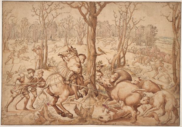 Editor: Here we have "Boar Hunt", an ink drawing with gouache by Titian, housed at the Städel Museum. It gives me a secretive feeling; everyone’s spread out and emerging from the dense forest. What do you see in this piece? Curator: Ah, yes! A hidden narrative. The figures *are* emerging, almost like characters from a dream. For me, this isn't just about the hunt itself; it's Titian playing with perception. Notice how the line work is so free, not rigidly defined, especially in the foliage. Doesn’t it almost feel like you could get lost in those woods? Editor: It does! And the boar is so faint, almost ghost-like. Why this looseness? Curator: Precisely! This sketchiness suggests a fleeting moment, a memory perhaps. Consider that Titian wasn't just depicting the hunt, he was capturing its *essence*. A king's chase might not have really played out like this in real life, yet on the page, he seems to make an interpretation of that reality. You following me? Editor: Definitely, it’s more about the *feeling* of the hunt. Curator: Yes! That thrilling uncertainty, the blur of motion, the inherent danger. Imagine the sounds, the smells… Gouache and ink were excellent for conveying that fleeting sensation! Editor: It’s interesting how a relatively simple drawing can evoke such a complex scene! Curator: It’s pure magic, isn't it? It's that touch of unfinished quality that sets the scene off and opens us up to see it personally. What started as lines on paper ends up inviting us in.