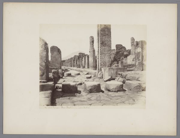 Curator: This intriguing photograph is titled "Via dei Sepolcri te Pompei," taken sometime between 1857 and 1914 by Giorgio Sommer. Editor: The desolation really strikes me. The faded tones, the ruinous architecture... It’s a stark scene of antiquity captured on a plate, all crumbling edges and a ghostly stillness. Curator: Absolutely. Sommer’s choice to photograph Pompeii's "Street of Tombs" presents a fascinating look at how death was integrated into the social fabric of this ancient city. Notice how the tombs are located outside the city walls, marking a liminal space. The image hints at ideas concerning social status and memorialization. Editor: I see your point about liminal space and societal display, but look at how Sommer has framed the image. The geometry of the remaining structures—the archways, the clean lines of the tombs themselves—leads the eye deep into the composition, playing with depth and perspective. Light and shadow sculpt the ruins. Curator: This work offers us a view into the layers of history and trauma embedded within Pompeii, particularly what such historical narratives exclude, such as gender, sexuality, race and class struggles. The aftermath of the eruption continues to inform modern memory and anxieties surrounding power and nature, and the way the street is devoid of life feels relevant to consider. Editor: Precisely! The photograph evokes a specific time and place and then transcends it by drawing attention to formal pictorial components. What survives of the real and once populated Pompeii still adheres to principles such as balance and rhythm. Curator: What this image shares then is that it stands as both an artifact of a particular moment in history and a potent meditation on social loss, memory, and resilience in the face of destruction. Editor: I'd also say the sepia tones provide a softness and texture, inviting reflection and contemplation of impermanence and form, a convergence of materiality and time.