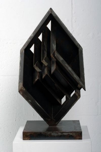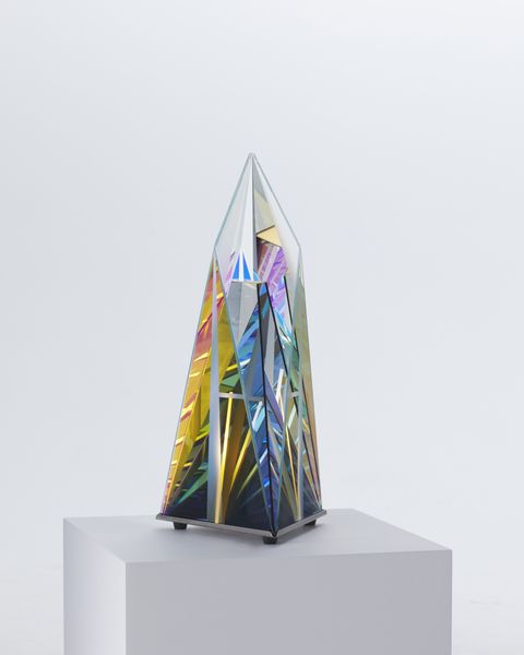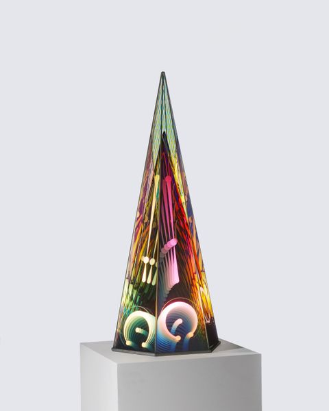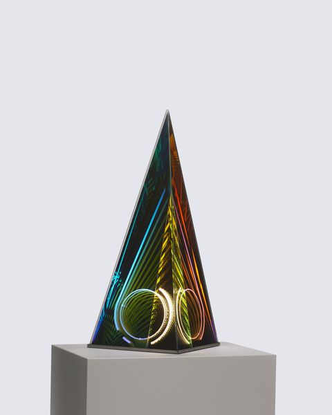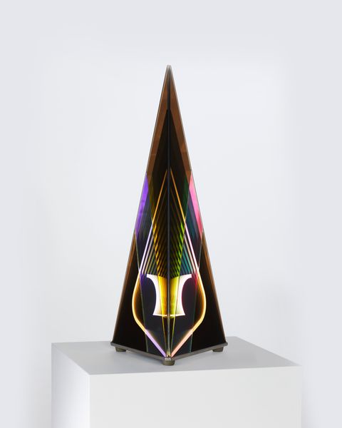 Ray Howlett made this shimmering piece, titled ‘Elbowing’, out of glass, at some point in his career, and it’s a real head-turner. The way Howlett manipulates light here is just captivating. It’s all about how light interacts with the surface, bending and bouncing off it. Look at how those linear patterns aren’t just on the surface, they seem to go deeper, creating this illusion of space within the solid form. The colour palette, with its iridescent blues, greens, and yellows, gives the sculpture an almost ethereal quality. The sharp, clean edges contrast with the fluid, shifting colours, which reminds me a little of those op art paintings by Bridget Riley from the '60s. Howlett’s taken something solid and made it seem alive, in motion, like a fleeting moment captured in glass. It's a reminder that art, like light, is always in flux, always changing.