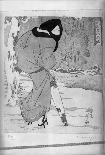 Editor: This is "Fuji in the Distance from Shimotsuke Province" by Hokusai, a woodblock print. It feels very stark, almost monochromatic, with these travelers ascending a snowy path. What can you tell me about the cultural significance of Mount Fuji in Japanese art? Curator: Mount Fuji wasn't just a mountain; it was a symbol of national identity, a sacred site, and a source of artistic inspiration. Hokusai, in depicting these pilgrims, taps into the widespread cultural practice of pilgrimage and the socio-political landscape that enabled such journeys. Editor: Pilgrimage as a popular cultural movement, I see. Curator: Exactly. The print also reflects the rising popularity of landscape prints as accessible art forms for a growing urban audience, catering to their desires for connection with nature and tradition. How do you think this piece functions as part of a larger series? Editor: I see it as a microcosm of Japanese society at the time. Thanks, that gives me a fresh perspective! Curator: Indeed, it’s a visual window into the social fabric of 19th-century Japan.
