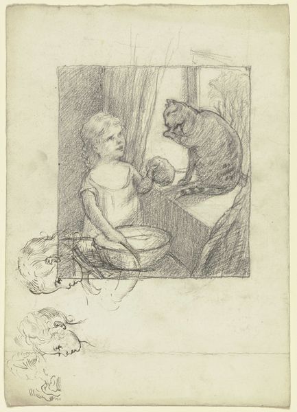 This drawing, made by Lorenz Frølich, presents a scene dominated by delicate lines and a subdued palette. At first glance, the composition draws you to the central figure of a little girl poised to strike her doll, placed on a small chair. The texture is suggested through fine hatching and cross-hatching, lending depth to the room’s background. The arrangement of figures—the girl, doll, and a watchful cat—forms a semiotic tableau, rich in suggested meaning. Frølich uses the domestic setting to explore themes of power, innocence, and the performance of social roles. Note how the scale of the figures, with the doll as a diminutive stand-in, creates a hierarchy that’s both playful and telling. The cat in the background adds another layer, acting almost as a silent observer. Ultimately, the drawing functions as more than just a charming depiction of childhood. It invites us to consider how even in the most seemingly innocent scenes, complex social dynamics are at play, rendered through the artist’s keen formal choices.