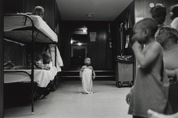 Donna Ferrato captured this black and white photograph of Margie and her four sons at the Olive Branch Mission in Chicago. This image, taken during Ferrato's work documenting domestic spaces, presents a poignant view into a family navigating homelessness and addiction. Margie's gaze speaks to the complexities of motherhood under the weight of systemic challenges. Her story, etched in the lines of her face, reflects the intersectional issues of poverty, race, and drug addiction which disproportionately affect women of color. The space, crowded with bunk beds and belongings, tells of the lack of privacy and the communal nature of shelter living. Ferrato’s work confronts us with the raw realities faced by many families, urging us to acknowledge the human stories behind the statistics. It asks us to reflect on our society's role in creating and perpetuating cycles of poverty and addiction, while reminding us of the resilience of the human spirit.