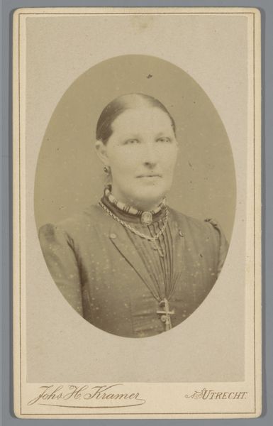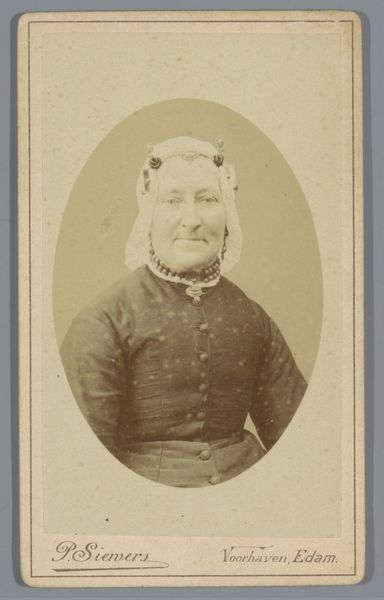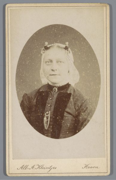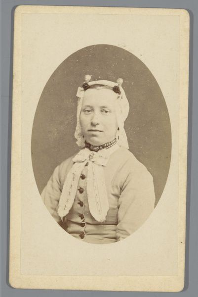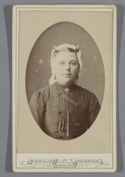 Willem Gerhardus Kuijer made this portrait of Betje van Ammers, a photo on cardboard, in the late 19th century. This piece offers a glimpse into the visual culture and social norms of the time. The photograph captures van Ammers in a traditional Dutch cap, her expression suggesting both a sense of dignity and perhaps a hint of the constraints placed upon women in that era. The details of her clothing, from the striped fabric to the modest buttons, speak to the values of simplicity and practicality often associated with middle-class life. Kuijer, operating his studio in Amsterdam, would have been catering to a clientele eager to capture their likeness in the latest photographic style. This portrait, then, is not just an individual likeness but a reflection of societal expectations and the performance of identity within a specific cultural context. It invites us to consider the roles individuals played and the stories they silently carried.