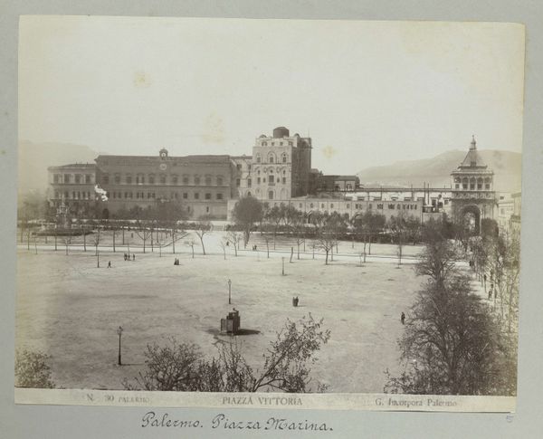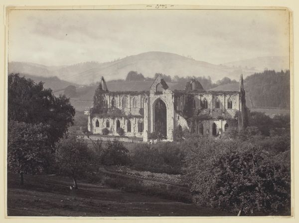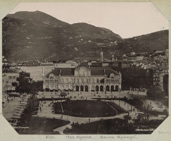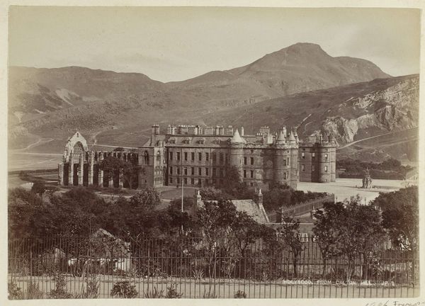 Editor: Here we have "Holyrood Palace in Edinburgh, gezien vanaf Calton Hill" by James Valentine, taken sometime between 1870 and 1890. It's a gelatin-silver print, giving it this lovely sepia tone. I’m really struck by how the photographer used a relatively new medium to capture a very traditional subject. What do you see in this piece? Curator: I'm drawn to the material presence of the print itself. Consider the chemistry involved: silver reacting to light, fixed onto paper. It’s a material document of a specific time and place, mediated through industrial processes. Notice how the granularity of the print reveals the technology at work, a stark contrast to the romantic subject matter. Editor: That's interesting, because I was thinking about how romantic it feels – that stark contrast you mentioned! Do you think this mass-produced photography challenged traditional, handmade depictions of such iconic architecture? Curator: Absolutely. The rise of photography democratized image production and consumption. While traditionally only the wealthy could afford painted portraits or landscapes, now, through the mechanization of image-making, a broader audience could engage with depictions of power, of "high culture." But also consider the labour involved. Who were the technicians in the darkroom? What were their working conditions? This is an industrial product as much as an artistic one. Editor: So, you're saying the image’s significance lies not only in its subject matter, but in the context of its production and consumption in Victorian society? Curator: Precisely. This isn't just a pretty picture; it's a material object embedded in a network of social and economic relations, speaking to broader shifts in technology, class, and taste. Editor: I never thought about it that way. It's more than just a snapshot of a palace; it’s about the machinery behind the shot itself and what it reveals about that time. Curator: Exactly. Analyzing art through its material production opens up whole new avenues for interpretation.