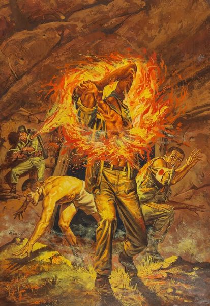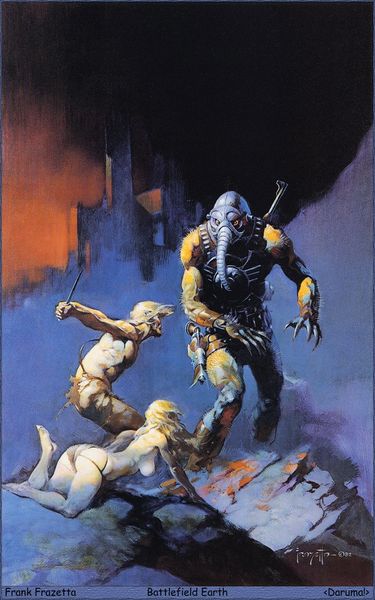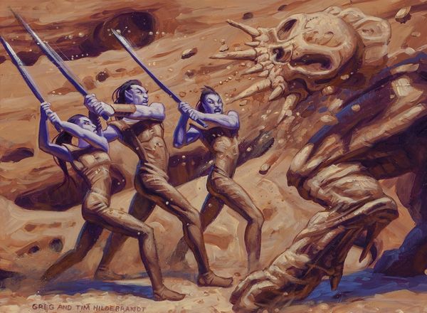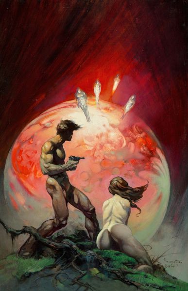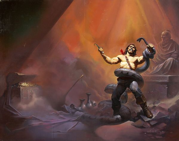 Boris Vallejo, born in 1941, crafted "Doc Savage; Quest of the Spider," a work that immediately grabs the viewer with its intense composition. The interplay of the muscular figure and the looming spider creates a dynamic tension, enhanced by the warm, earthy tones dominating the palette. This image presents a fascinating study in contrasts, where the hyper-masculine form of Doc Savage is pitted against the primal fear evoked by the giant spider. Vallejo masterfully uses chiaroscuro, highlighting the contours of Savage's body, emphasizing his strength. But the spider's looming presence questions this power, destabilizing the conventional hero narrative. Consider the semiotic implications: the spider, often a symbol of entrapment and the feminine, challenges Savage's virility. The chains, though broken, suggest a struggle against oppressive forces. Ultimately, the painting's formal elements work together to create a narrative that goes beyond simple adventure, touching on themes of power, fear, and the subversion of traditional roles.