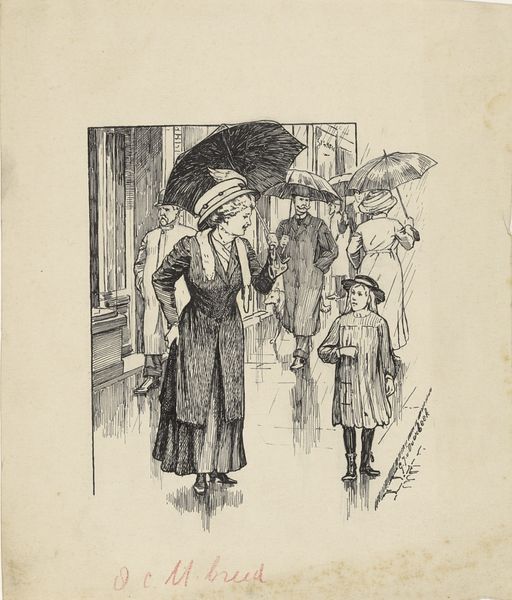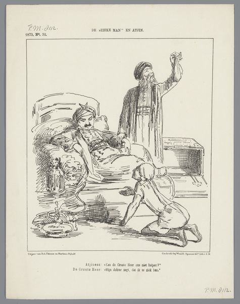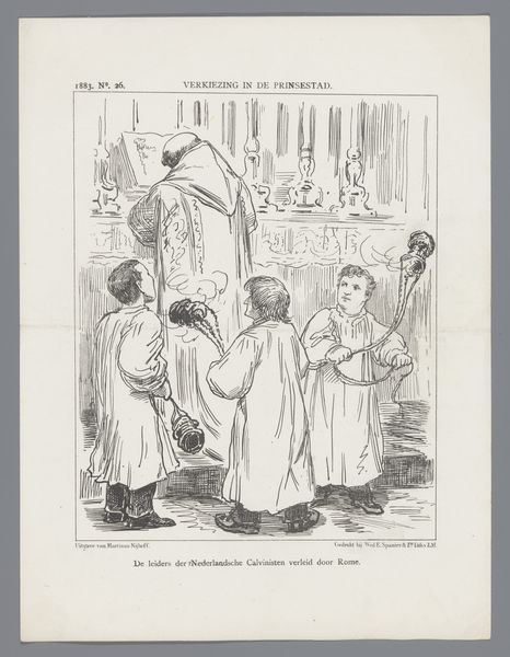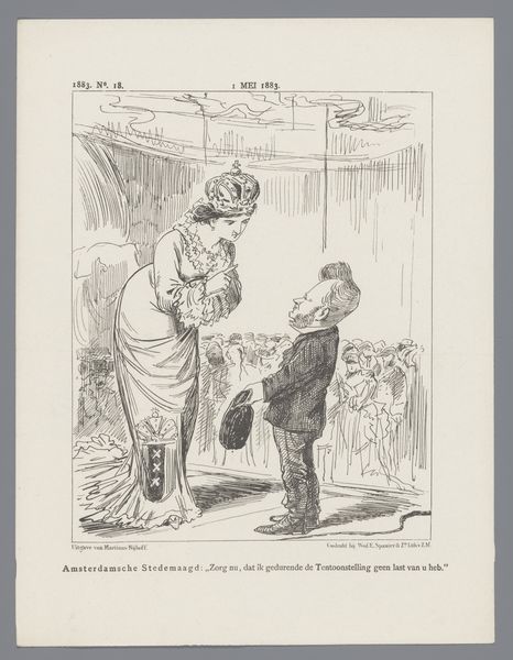 Editor: This print, "Spotprent over de grondwetsherziening, 1887" by Johan Michaël Schmidt Crans, uses ink and drawing to make a pointed commentary. The sharp lines and caricature style give it a sarcastic bite, I think. What exactly is this satirizing? Curator: It feels like peering through a historical keyhole, doesn't it? Look at how Crans uses exaggeration, not just to amuse, but to amplify the political discord surrounding the 1887 constitutional reform in the Netherlands. The figures are puffed-up stereotypes. What does it tell you about the artist’s perspective? Editor: That there was no consensus. I suppose. But who are all those figures? The captions refer to them by number, and there’s a woman resembling a mother figure. Is she the Netherlands? Curator: Precisely! She’s a representation of the Dutch nation. And those skeptical men represent factions within the government, each reluctant to acknowledge the 'Herziene Grondwet'—the revised constitution—as their own. Notice how Crans frames her. It hints at her inherent power, doesn’t it? He almost teases us, questioning who the Netherlands *really* belongs to. What does that imply? Editor: That there were tensions. Each wants it, but only on their terms, perhaps. So, the cartoonist uses the 'mother' figure to suggest that. How clever! Curator: Yes! He challenges us to think about who has the right to claim ownership and shape its future, doesn't he? Editor: Absolutely! Political cartoons can be powerful, capturing complex ideas with a deceptively simple image. It is good to see it wasn't only recently that they did that. Curator: Precisely! Next time we think that we live in complicated times, maybe we should see they were always so. And what a clever way to discuss it!