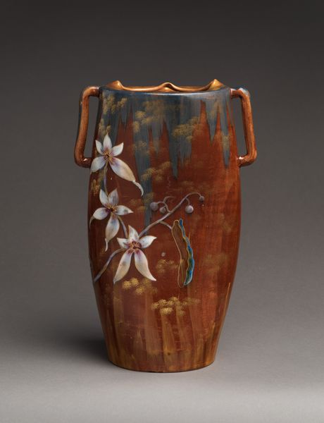 This vase was made by Chelsea Keramic Art Works between 1872 and 1889, from earthenware, with a lead glaze. The vase presents a striking combination of geometric form and organic decoration. Note how its angular, octagonal body contrasts with the fluid, curvilinear forms of the applied iris motif. This juxtaposition creates a visual tension, a kind of dialogue between the manufactured and the natural. The earthy tones of the glaze, predominantly browns and creams, enhance the vase’s tactile quality, inviting a closer inspection of its surface. The iris, rendered in relief, emerges from the vase's surface, its petals and leaves casting shadows that animate the composition. As a sign, the iris carries multiple cultural associations, including royalty, faith, and hope. The strategic placement of the iris, dominating one face of the vase, suggests a deliberate attempt to infuse the object with symbolic meaning. Consider the interplay between form and function. The vase, ostensibly a utilitarian object, transcends its purpose through artistic intervention. The angularity of its form, softened by the organic motif, speaks to a broader artistic concern with reconciling industrial production with aesthetic expression.