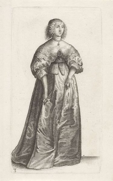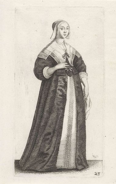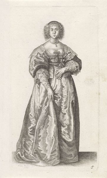 Editor: This is "Mulier Generosa Anglica", an engraving by Wenceslaus Hollar from 1644. I am struck by the precision of the lines. What can you tell me about Hollar's approach to creating such detailed form in his prints? Curator: Notice how Hollar has employed a variety of line weights and densities to describe the different textures and materials. The velvet of her cloak, for instance, is suggested by a dense network of short, irregular lines, while the satin of her skirt is conveyed through longer, more parallel strokes. Consider also the directionality of these lines. How does Hollar use the arrangement of lines to indicate the fall of light and the folds of the fabric? Editor: It’s fascinating how such simple lines create such dimensionality! Do you think the restriction of engraving influenced the overall composition and design of the figure? Curator: Undoubtably. The linear precision and clarity inherent in engraving necessarily lead to a certain formality. Notice the relatively shallow depth of field and the figure's planar orientation, presented in profile, almost like a fashion plate. This allows Hollar to focus on the intricate details of her costume without the complexities of deep perspective. Consider how the absence of color directs our attention to form and line. How might a painter approach the same subject? Editor: It’s interesting how technique and medium so fundamentally shaped the aesthetic qualities of this piece. Thanks, I am starting to see it in a new light. Curator: Indeed, attending to the formal elements brings us closer to understanding the artist’s vision and the unique qualities of the medium.