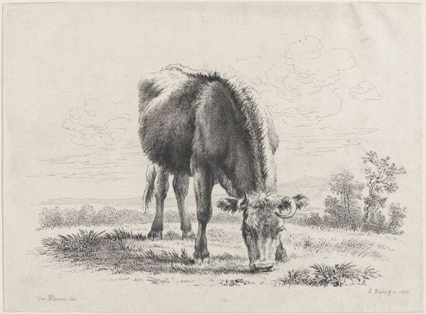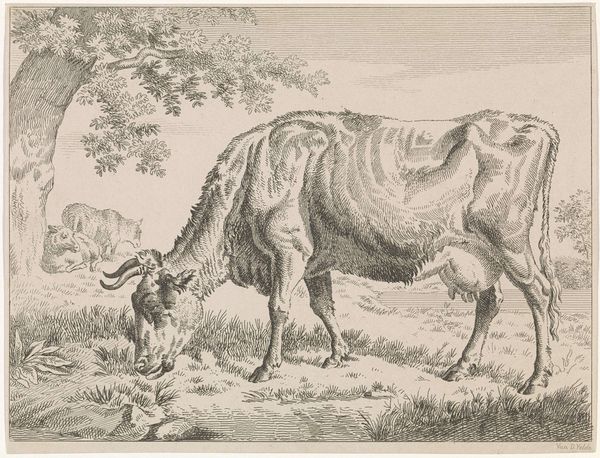 Curator: Right, let’s dive in. Before us is an engraving from around 1670-1720, known as "Grazende koe bij twee schapen," which translates to "Grazing cow with two sheep." Its creator? Well, that's lost to history—it's attributed to an anonymous artist, and it resides here at the Rijksmuseum. Editor: Okay, first impression? It's…peaceful, almost unnervingly so. It feels like stepping back in time to a simpler, slower pace. The light is so gentle; I want to be there lying in that field with those sheep. Curator: That sense of peace isn’t accidental, I think. This work participates in a longer tradition of pastoral imagery that idealizes rural life. It presents a counter-narrative, perhaps, to the urban anxieties of the time, particularly among the rising merchant class in the Netherlands. This imagined return to nature allowed for a reimagining of labor and the landscape. Editor: Interesting. The detail is impressive, considering it's an engraving. Look at the texture of the cow's fur, and the way the artist has captured the light on the grass. There is something about the texture in the cow's fur; this is also juxtaposed with a certain stillness and emptiness from the light background which somehow makes the depicted landscape also feel lonely. It's more than just realistic; it evokes a mood, a feeling of quiet contemplation. Curator: Precisely. Realism emerges not just in the faithful representation of the animals and the landscape, but also in the underlying social values. Consider the implications of showcasing agricultural life as inherently tranquil and virtuous, possibly downplaying the socio-economic hardships and realities that agricultural communities historically encountered. There’s an argument to be made about idealizing labor and life under the guise of "realism" which we ought not forget. Editor: That is an interesting insight. It makes me wonder about the artist’s intentions. Are they glorifying nature, or just documenting it? Or perhaps they're gently nudging us to appreciate a way of life that's slipping away? Curator: Perhaps all three. And it also brings up questions around accessibility and who this artwork was created for. Prints like these were often more affordable and could circulate more widely than paintings, bringing this idealized vision of rural life to a broader audience. Editor: You’ve certainly given me a lot to mull over. It appears at first glance to be such a simple scene but holds deeper complexities regarding how social concepts might intersect and take a foothold on this piece. Curator: Agreed. Even seemingly simple pastoral images carry rich and complex layers of meaning once we begin to contextualize them within their historical, social, and economic moment.