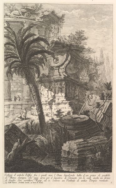 Curator: This is "Ruïne van Kasteel Feltz," or "Ruins of Feltz Castle," an etching and drawing created around 1855 by Martinus Antonius Kuytenbrouwer Jr. The work, rendered in a landscape style, depicts the remains of a historical building overtaken by nature. Editor: There’s a melancholic air hanging over this piece. It feels somber, even lonely, looking at the detailed, almost clinical rendering of these decayed stones. You can almost feel the chill of the abandoned space. Curator: Well, that’s a classic Romantic response! But I see it as speaking to the relationship between labor, architecture, and the cyclical nature of materials. Think about the physical work involved in constructing the castle originally, the lives that were implicated in its existence, and now it has become something else, reclaimed. How do social structures shape our physical environments, and how do those environments shape labor, even centuries later? Editor: Yes, the Romantic interest in ruins as a symbol of time and mortality is clear here. But, placing it within its historical moment, think about what the castle ruins might have represented to people in the 19th century: perhaps a symbol of the transience of power, or the cyclical nature of civilizations. How did political and social change shape artistic expression around national identity? Curator: I think it prompts the viewer to examine production itself: what does it mean for an artist like Kuytenbrouwer to reproduce a ruin? Is he contributing to the "romanticization" of it, or simply documenting the raw, material effects of time? And what implications did etching processes have on the wider distribution of images during the industrial revolution? Editor: That's an interesting angle. These prints, like many images circulated at the time, played a part in shaping a national narrative. This artwork invites reflection on the very nature of power and memory. Curator: True, by examining the materials and production behind this print, we uncover fascinating insights into cultural values surrounding historical objects. Editor: Absolutely. Both the print and its subject point to larger questions about how we build, commemorate, and ultimately contend with the legacies of power throughout history.