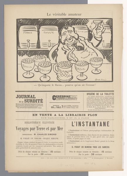 Curator: Jean-Louis Forain created this lithograph titled "Caricature of Émile Zola during an inquiry" in 1898. What catches your eye? Editor: The stark lines, the almost brutal simplicity of the drawing itself. It feels rough, immediate, as if snatched directly from the satirical journals of the day. A stark image produced for mass consumption. Curator: Indeed. Forain’s caricatures were regularly featured in publications such as Le Figaro and Le Psst!, and were tools to amplify social commentary and, at times, to skewer political figures and public opinion. Zola here looks so uncomfortable under scrutiny. Editor: The material process adds to the message. A lithograph—cheap to produce, easily distributed. It suggests accessibility, a democratization of opinion, whether or not that opinion is flattering. The bottom part has several commercial advertisements. Were the illustrations sold along the newspaper and advertisements? Curator: In effect, yes. This was printed matter that lived in a commercial space. Consider the text at the top: “Inquiry into the French Spirit.” What do you make of the exchange? Editor: There is a cynicism, that what it means to be French, it “disgusts me, sir”, declares the one being surveyed. It really encapsulates a widespread feeling, then, perhaps especially within artistic circles, and the figure on the right taking notes must be quite surprised. Curator: Precisely, Forain captures Zola at a pivotal moment in his career and the broader societal unease of the fin de siècle. Note also, how Zola's exaggerated features emphasize the artist's intent. The high forehead, the somewhat drooping posture – all communicate a particular message. Editor: It’s fascinating how the medium itself, cheap print meant for wide dissemination, becomes part of the cultural landscape, reflecting and shaping public sentiment. The whole production smells of the quick turn around in opinions in France. Curator: Absolutely. This image, through its production and distribution, played a role in shaping that sentiment. Editor: The speed of image creation for fast media of distribution! We are left to interpret the artist's take. A valuable snapshot.