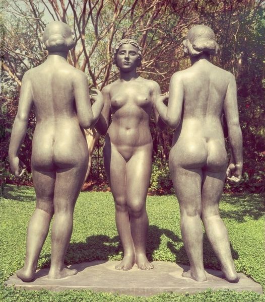 Editor: We’re looking at "Marxizm de Sad" by Arsen Savadov, a photograph from 1998. The scene is… well, it’s quite striking. There are three figures in a wooded area wearing bunny ears, and their level of dress varies. It’s the juxtaposition of these elements that grabs my attention. How would you interpret the composition of this piece? Curator: Let's examine the formal elements. Notice the strong diagonal lines created by the figures’ positioning and the fall of light, dividing the composition. How does that dynamic interplay influence your understanding? Editor: It certainly creates a sense of unease, almost a forced perspective. I suppose I'm so used to more staged and controlled photography that I forget it might also have been captured quickly in available light? Curator: The setting itself provides a backdrop that is naturalistic, clashing against the evident artifice of the costumes and props. Consider also the textures – the smoothness of the skin, the roughness of the tree bark, and how the fabric contrasts against skin. What effect do they achieve? Editor: It amplifies the disquiet I felt earlier, because now there's something that almost feels uncanny in these contradictions and oppositions. Do you find the light adds to that effect, given how flat it looks overall? Curator: Exactly! The near lack of strong shadows, in concert with a shallow depth of field, does not give precedence to any particular detail. Editor: Right, so this forces the viewer to examine everything equally. It has this flattened quality despite being a photograph. Is this emphasis on formal values, pushing it more in the conceptual direction? Curator: The lack of clear symbolic cues within the narrative is designed to confront the viewer through disruptive visual tensions and surface appearance. What do you make of that conclusion? Editor: That's helpful because, initially, I got distracted trying to work out "the story" rather than understanding how all of its components contribute equally to that striking composition. Curator: I am in agreement!