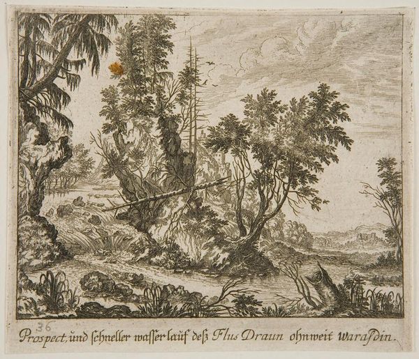 Curator: Melchior Küsel's small etching, "View of the waterfall in the Steirmark near Murek at the Ocean," presents a meticulously rendered natural scene. It's all textures and light, isn't it? Editor: It feels wild, almost Romantic in its untamed portrayal of the landscape, despite the small scale of the printing plate. Curator: Absolutely. The etching process itself, with its reliance on acid and metal, mirrors the earth's own geological processes, creating a fascinating parallel between the means of production and the subject matter. Editor: And the density! It feels like a captured moment, full of vital energy. I can almost hear the rush of the water. Curator: The printmaking process allowed for the mass dissemination of such images, shaping perceptions of the natural world for a broader audience. Editor: It’s lovely to think about how something so detailed could travel and spark imaginations.