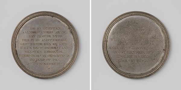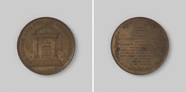 Curator: What strikes you most about this bronze relief, Editor? To me, this medal, “Bouw van oude mannen- en -vrouwenhuis te Brussel,” made in 1824, speaks volumes about societal priorities. Editor: Initially, the density of detail, paired with what seems a very rigid structure. It almost feels claustrophobic, despite representing architecture, a space. Curator: The image presented on the coin features what looks like a highly structured almshouse under construction in Brussels. Consider the historical context; what would building such a home represent politically and socially at that time? Editor: Well, socially, it signals a developing civic consciousness, wouldn’t you say? The almshouse suggests communal responsibility. But then, consider power dynamics of early 19th-century Europe; its very public nature might also symbolize state authority, and control over vulnerable populations. Curator: Exactly. Almshouses themselves, throughout the Medieval and Early Modern eras, were complex symbols. Think of the symbolic meaning invested in these places - often a visible display of charity, while also serving as a mechanism for managing social order. Note how the architecture is highlighted; perhaps even idealized? What symbols do you discern in its representation? Editor: The architectonic depiction… it’s formal and symmetrical. To my eye, this evokes stability and control rather than a nurturing, compassionate ideal, ironically. And consider the reverse; inscribed text serves to commemorate the project. Curator: Indeed. Consider that commemorative aspect. Bronze as a medium links to permanence; therefore the medal immortalizes not only a building, but a concept: institutional care. That carefully crafted image broadcasts particular values about aging, poverty, and the state’s role. Editor: The interplay between this relief, text, the intent...all really brings forth ideas around institutional memory. Not just brick and mortar, but what it *represents*. I find myself questioning what futures were imagined as the coin was struck? Curator: Absolutely. We’re left to ponder, what stories would residents, philanthropists, or the state share about the home’s real impact over decades? Medals can spark such complex, necessary discussions about history and lasting impact, can't they? Editor: They do. Art is never truly mute, but always shaped by politics, societal aspirations, often contradicting realities that demand investigation.