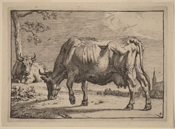 Francesco Londonio created this monochrome print, titled 'Shepherd Wearing a Cape Driving a Flock,' using etching. The composition teems with life, depicting a shepherd amidst his animals, seemingly in motion. Londonio masterfully uses line and texture to create depth and form. Observe how the varied strokes give a tangible quality to the fleece of the sheep, the rough bark of the trees, and the folds of the shepherd's cape. The density of lines and the contrast between light and shadow define the shapes of the figures, creating a sense of three-dimensionality on a flat surface. The etching is more than just a pastoral scene. Londonio invites us to consider the relationship between humanity and nature, and the ways in which we structure our understanding of the natural world. It's a cultural construct that Londonio subtly interrogates through the sheer density of the composition and the dynamic rendering of his subjects.