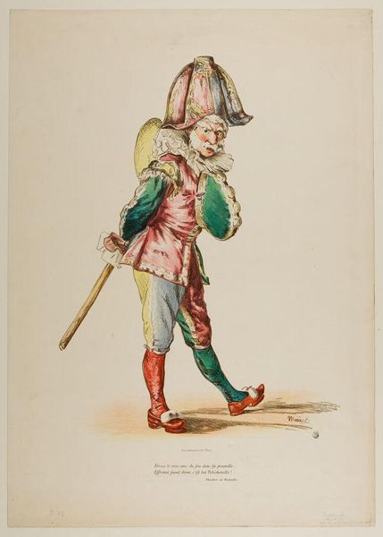 This hand-colored etching, *Approval of the Safety-Chain, No. 2,* was created by Pierre Roch Vigneron, though the exact date is unknown. It provides a satirical comment on the social structures of post-revolutionary France. The image presents a caricature of a bourgeois man, identifiable by his dress and hat, struggling to hold up his trousers. The 'safety chain' mentioned in the title dangles uselessly beside him. Vigneron uses visual codes common in political cartoons of the time to critique the perceived excesses and anxieties of the middle class. The exaggerated features and precarious stance hint at a society destabilized by recent upheaval. Understanding this artwork requires delving into the political and economic conditions of early 19th-century France. Contemporary periodicals and pamphlets would offer insights into the debates around social mobility and class identity that shaped Vigneron's work. By studying these resources, we can better understand the public role of art as a form of social commentary and critique.