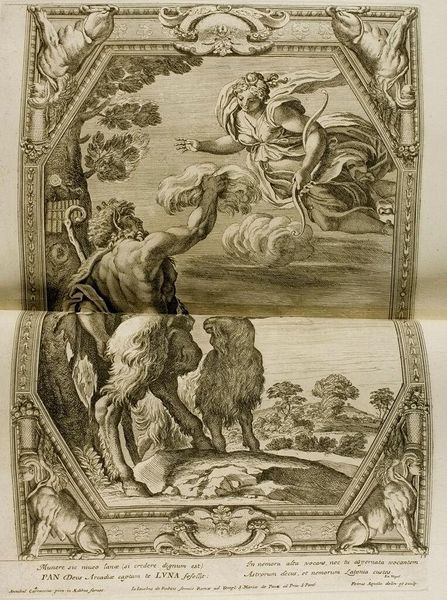 Curator: This is Pietro Aquila's "Galeriae Farnesianae: Mercury," a striking engraving. The drama! Mercury plummets from the sky, horn blaring. What catches your eye? Editor: The overt display of idealized male forms, and how they are positioned. What does the positioning of the figures tell us about power and perception in 17th-century Rome? Curator: Exactly! Consider the historical context: the Farnese Gallery was a celebration of masculine power and classical ideals. How might Aquila's print both uphold and subtly critique these notions? Think about the male gaze, and who is afforded agency. Editor: That’s a great point. It makes me consider who this work was intended for, and how their position influenced their gaze. Thanks for opening my eyes to this. Curator: And thank you, for reminding me that art is never truly neutral. It reflects and shapes the society from which it emerges.