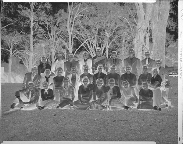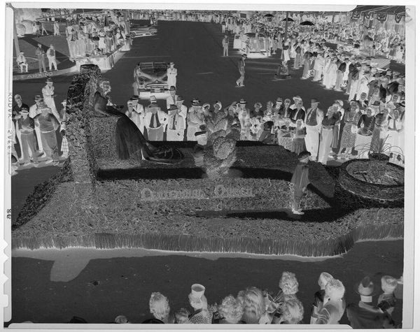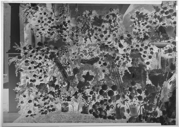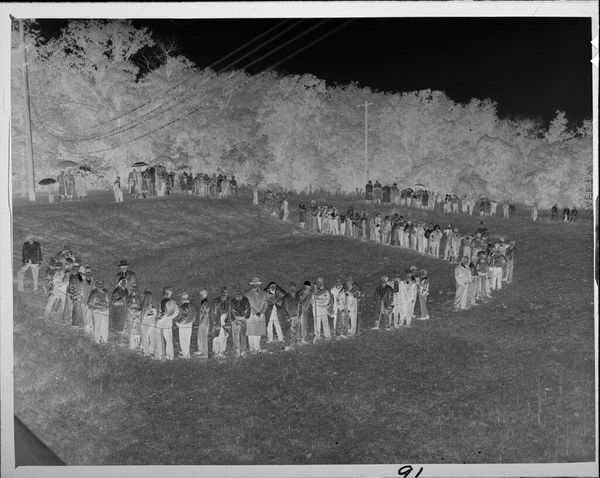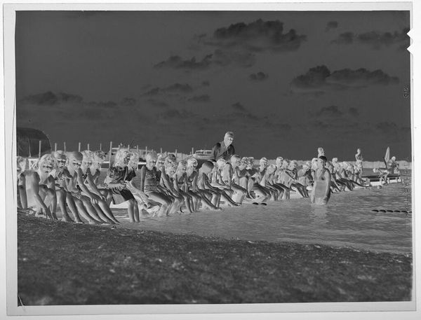 Editor: This photograph by Ken Whitmire Associates shows a large group of women, taken from above. The high vantage point gives it a surreal, almost dreamlike quality. What do you see in this piece? Curator: The inverted tones create a sense of otherworldliness, don't they? The women, uniformly dressed, become a pattern, a collective. The aerial perspective transforms individual faces into a sea of figures. What cultural memories does this evoke for you? Perhaps a sense of ritual, or communal identity? Editor: I see that. It makes me think about anonymity and belonging at the same time. It's like they're individuals submerged in a larger purpose, a single unit almost. Curator: Precisely. The uniformity of dress and the organized formation suggest a shared experience, but the inverted colours hint at something hidden, something not immediately apparent. Perhaps a critique of conformity, or a celebration of it? Editor: That’s interesting. I hadn’t thought about it that way. Thanks for highlighting those possibilities! Curator: My pleasure. It's a work that invites us to consider the power of symbols and the weight of collective identity.