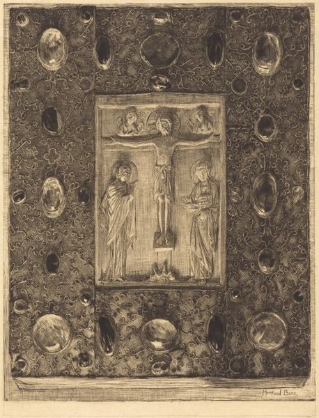 Curator: Let's turn our attention to Célestin Nanteuil's 1832 etching, "Notre-Dame de Paris," currently residing at the Metropolitan Museum of Art. Editor: It's so dense, isn't it? Dark, brooding... a feeling of Gothic Revival theatricality compressed into this single print. The contrasts are so stark, with very little mid-tone to let the eye rest. Curator: Precisely! Nanteuil masterfully uses etching to convey a powerful scene and emotional depth. Think of the context: Romanticism prized emotion, individualism, and the revival of medievalism. Consider, too, that this etching, being a print, allowed for the mass production and dissemination of this romantic view of architecture and history. Editor: The symbolic language practically shouts at you. You have figures tucked away in nearly every architectural nook; each feels steeped in centuries of narratives. The upper statues... Is that Justice, perhaps, hovering over the implied chaos below? There's an implied tension, a silent narrative playing out in the shadows. Curator: Good eye. These repeated, historical depictions are interesting when we consider who had access to see them. As the original Notre-Dame cathedral was falling apart and becoming unsafe in the late 1700’s, it only was made stable through its new repurposing as a "Temple of Reason" during the French Revolution, where it was later decreed that this location could later return to it's true religious status after Napoleon seized power. This print is like a memory palace, with architectural and artistic traditions referencing France’s deep and conflicted history. Etchings could be widely circulated; therefore, it democratizes and commodifies gothic iconography. Editor: The contrast between the dark interior scene and the ornate framing pulls you in, like peering through a window into another time. There is a story unfolding here in this composition that touches on the darker realities, and a deeper complexity surrounding it. Curator: A darkness readily available for the masses. This speaks volumes about Nanteuil's choices and how printmaking functioned in the Romantic era and beyond. It shows how something beautiful also has it's social realities to be aware of, or sometimes hidden from the light. Editor: Indeed. It's much more than just an etching of a landmark, isn’t it? A portal through the material into something deeper.