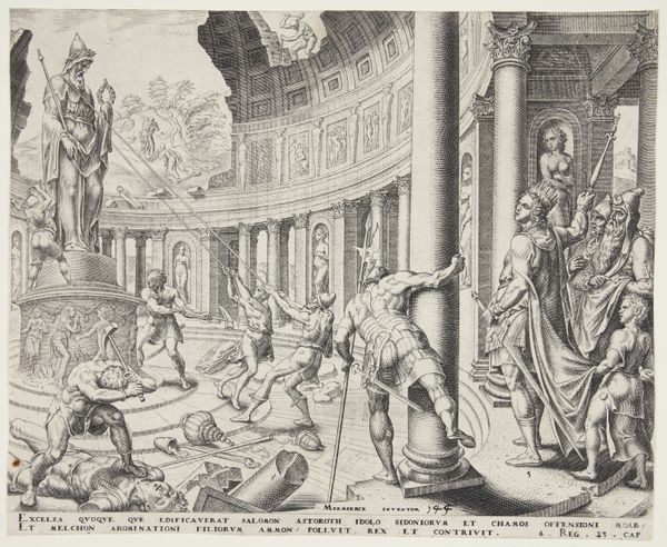 Editor: Philips Galle's "Standbeeld van Zeus in Olympia," dating from the late 16th or early 17th century, is a print, an engraving, really. The sheer busyness of it strikes me first – so much is going on. What do you make of this overwhelming composition? Curator: Overwhelming is a brilliant word for it! For me, prints like this are time capsules. Imagine encountering descriptions of Zeus, maybe snippets from Pliny, and then seeing Galle’s vision. It's not just about accuracy; it's about conjuring a sense of awe. Do you get that almost feverish, imaginative energy? Editor: Definitely. I see how the engraving style adds to that slightly frenetic feeling. It makes it almost dreamlike. Is that Baroque influence? Curator: Precisely! The Baroque wasn’t afraid of dramatic excess. Think about it – the statue looms, while all around, figures are wrestling, paying homage. It’s theatre! Galle isn't just depicting Zeus; he’s staging a whole world, wouldn’t you agree? Editor: Yes, that performance aspect really comes through. Seeing this almost reminds you of the history of the Olympic Games in Greece, but from Galle’s eyes! Thank you; it certainly made me see how much stories can be told in a piece of art. Curator: It also gave me a different perspective on this image. This also helps us in finding value within this artwork that reflects Zeus and a staged world together!