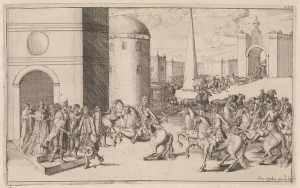 Editor: Here we have Arnold Houbraken's engraving, "Wreedheden in een stad begaan door turken," which translates to "Atrocities Committed by Turks in a City", dating sometime between 1681 and 1699. The chaotic composition, rendered in such detail despite being a print, evokes a powerful sense of turmoil. What compositional elements stand out to you? Curator: Formally, the arrangement pivots around two vertical elements: the turret on the left and the implied verticality of the gateway in the distance. Notice how Houbraken uses line and form to create visual contrast. The implied diagonal of the figures falling from the city walls is countered by the static authority of the seated figures on the right. The composition is, thus, self-contained. Editor: That’s a great point about the balance. It feels almost like a stage. Do the figures on the right, on their platform, act as audience and players at the same time? Curator: Observe how line and shape converge to construct form and content in the print. Note, in particular, the architectural backdrops on either side. One cannot but contrast it with the contorted forms of violence which erupt between them. Can this interplay of vertical and horizontal lines reflect themes of control and subjugation? How can the print be a critique of societal power structures and an argument for peace? Editor: So the piece is making use of visual forms in order to draw our eyes to how architecture mirrors acts of violence in early modern Europe. Thanks, I've never considered approaching the study of this type of narrative print from this viewpoint. Curator: Precisely. By focusing on the internal structure, the material qualities, and visual language of the engraving, we can move closer to a true appreciation of this work of art.