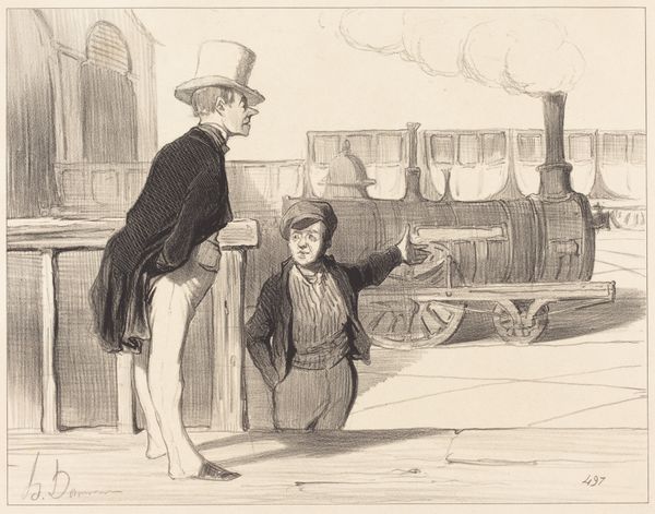 Curator: This is "The Bailiff's Man" by Honoré Daumier. I'm struck by how he uses lithography to capture the stark social realities of 19th-century Paris. Editor: Immediately, I'm seeing the top hat as a symbol of the bourgeoisie and the carriage practically oozing with wealth. It's a sharp contrast to the hunched figure of what I presume is the bailiff’s man. Curator: The print itself would have been produced and distributed widely in newspapers, making it accessible to a broad audience, a calculated move for social commentary. Note the number 13 displayed prominently on the carriage! Editor: Yes, the number 13 adds a layer of superstition and foreboding. It's not just about class difference; it's about the ill-fortune that seems to plague those enforcing the law, or perhaps those upon whom it's enforced. The carriage occupants seem unaware of the bailiff. Curator: The lithographic stone allowed Daumier to achieve incredible detail and tonal range. He effectively mass produced these images, challenging the elitist idea of art. Editor: For me, the image is a potent visual representation of social inequity and the psychological weight of class division, captured so acutely through Daumier’s choices. It’s a reminder of historical tensions still relevant today.