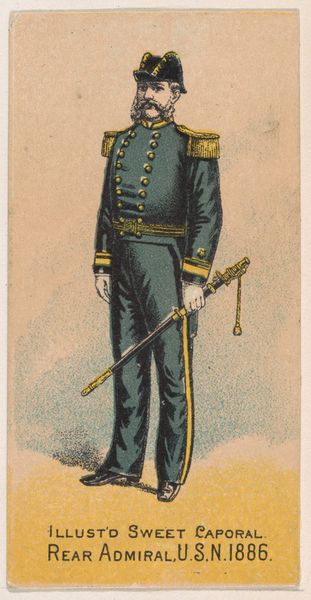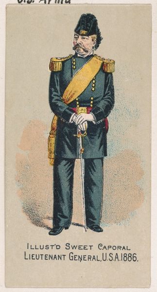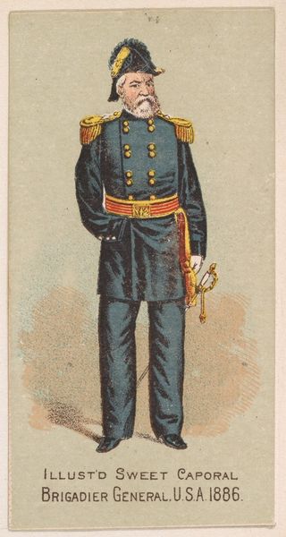 Editor: Here we have, "Officer, 1st Regiment, Iowa, National Guard," from 1888, a print drawing originally made as a promotional item by Kinney Tobacco Company. What strikes me is how formal and posed he is. Curator, what's your take on this image and its place in history? Curator: Well, this image provides an interesting glimpse into the popular culture and the construction of military identity during that era. Produced by a tobacco company, its purpose was promotional. How does that context shift your understanding of it? Editor: I see your point. Knowing it's an advertisement, it feels almost satirical, like they're selling a romanticized ideal of military service, packaged with their cigarettes. It feels like pure marketing and spectacle rather than, say, serious art. Curator: Exactly. And consider the distribution. These cards were inserted into cigarette packs, making them accessible to a broad public. How do you think this mass distribution influenced public perception of the military, especially in a period of Reconstruction and evolving national identity? Editor: So, this card served not only as an advertisement but also as a subtle tool for shaping public opinion, normalizing the military and potentially masking the complexities of the post-Civil War period? Curator: Precisely. The visual representation and its dissemination speak volumes about the social and political forces at play. It's not just a portrait; it's a cultural artifact that participates in shaping a public role for military, even promoting military service through a product intended for general consumption. What has resonated most with you about it, thinking of that broader scope? Editor: It's surprising how such a small, seemingly insignificant card can reveal so much about the intertwining of commerce, politics, and identity in late 19th-century America. Curator: Indeed. These visual texts act as little time capsules, revealing grander societal structures and attitudes about duty, patriotism, and national image-making that can often be obscured when considering 'high art' alone.