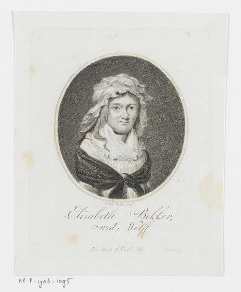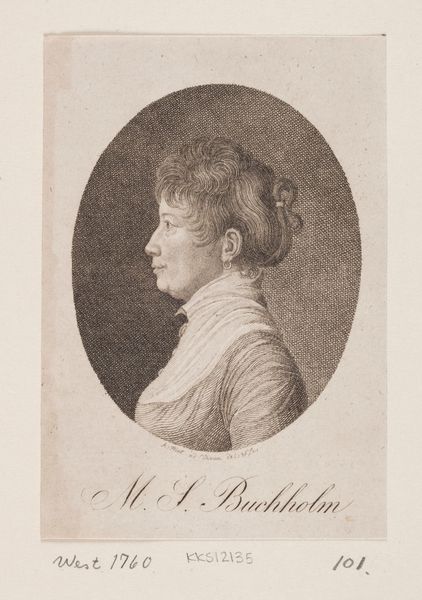 Curator: This delicate print captures the likeness of Wilhelmine Augusta Müller. Created between 1790 and 1812, it’s an engraving rendered by Georg Christoph Walwert, a superb example of neoclassical portraiture. Editor: My first impression is one of reserved dignity. The oval format, the profile view, the subdued palette... it all lends an air of classical solemnity. Curator: Indeed. The profile portrait format itself harkens back to ancient Roman coins and busts. Think of the power dynamics involved here – this style elevated the sitter, connecting her visually to ideals of civic virtue and aristocratic lineage, even through the seemingly humble medium of a print. Editor: Absolutely. And consider the clothing and hairstyle; although finely detailed, there is nothing ostentatious. It's elegant restraint – signaling status without screaming it. I am also interested in what emotional response the viewer may have given the sitter at the time. Was this woman deemed desirable or accomplished? It might be worthwhile investigating. Curator: An important question. Engravings such as this were widely circulated. So, the image and, consequently, Wilhelmine herself entered public discourse in ways accessible to broad sections of society. Furthermore, the print medium meant these images could travel long distances to distant diasporas or different locales to forge new understandings. Editor: And what can be said of her gaze? I note she gazes resolutely forward and seems very composed, suggesting a strength of character that feels very intentional. I would imagine that very deliberate artistic decisions were involved in deciding her affect. Curator: Precisely! It underscores the conscious effort to present a composed and idealized image of womanhood, mirroring the values and philosophical aims championed during the Enlightenment. Through the proliferation of images like these, it allows a wider segment of society to participate and consume portraiture, creating a symbolic lineage for the individual that intersects broader public spheres. Editor: This piece speaks volumes about how even a small engraving carries cultural significance and societal values. What a treat! Curator: Indeed, this engraving demonstrates the far reach of the print market and its capacity to promote identity through controlled dissemination and imagery. A worthwhile endeavor!