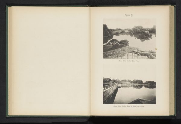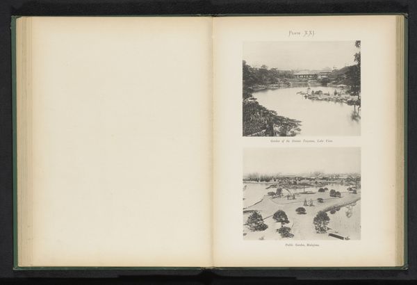 Curator: Here we have a photo by Kazumasa Ogawa, taken sometime before 1893. It is titled "Two views of the gardens of Daimio Tsuyama in Tokyo, Japan.” It shows a page from a bound album featuring two black and white photographs of Japanese gardens. Editor: I find the atmosphere of these images very evocative. They feel both tranquil and a little melancholic, perhaps due to the monochrome and the soft focus. There's something timeless about them. Curator: Ogawa was a pioneer of photography in Japan, using collodion printing. His works provide significant insight into how Japan presented itself to the world in the late 19th century. What stands out to you about the subject matter? Editor: I think the conscious cultivation of nature on display is significant. Japanese gardens have a history reflecting class structure and spirituality. These Daimio gardens would have been spaces of leisure and reflection for the feudal lords, separate from the lives of ordinary people. There is an inherent hierarchy built into the visual representation of land ownership. Curator: Exactly. Notice the specific visual vocabulary. Elements such as carefully placed stones, meticulously shaped trees, and strategically positioned bodies of water aren’t merely decorative; they serve as cultural markers. Each object, each scene holds deeper symbolic meanings tied to Japanese aesthetics. Editor: Absolutely. Also consider Japonisme—the influence of Japanese art and design on Western art. This image plays into and arguably shapes perceptions of Japanese culture at the time, often catering to Western tastes, and framing Japanese culture through a very specific, possibly exoticised, lens. These were designed as documents of a nation encountering modernity and attempting to create its identity in the Meiji era. Curator: It shows a Japan crafting its narrative, aware of its global audience. Even something seemingly as simple as a garden view speaks to profound historical, social and cultural processes. Editor: Examining images like this allows us to dissect how cultural identities were constructed and disseminated during periods of significant historical transition. I see a beautiful, peaceful scene – that must be read through complex layers. Curator: Indeed. Photography isn't a passive recorder. Ogawa's compositions speak of cultural exchanges and how images actively participate in forging our understanding of civilizations. Editor: Ultimately, these "two views" offer much more than just surface level visual data, but can invite complex reflection of identity, perspective, and historical representation.