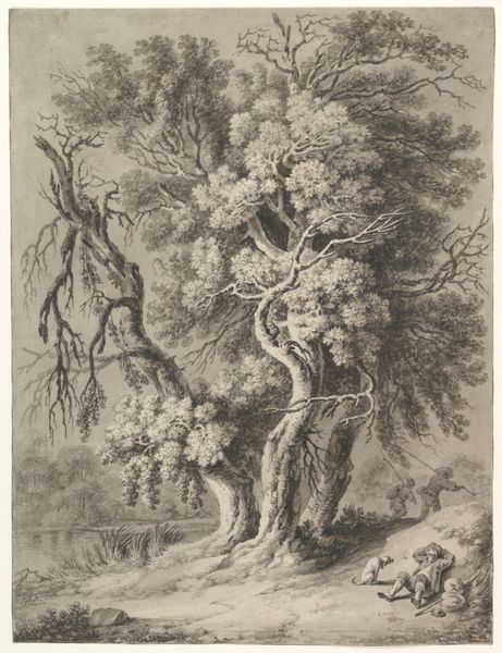 Editor: So, this is George Samuel's "Study of an Old Oak Tree, Water on Right, a Man on Left," made in 1806 using pen and ink. It strikes me as both imposing and delicate, a really captivating combination. What's your take on it? Curator: It presents a compelling exercise in form. Observe how Samuel employs hatching and cross-hatching. Do you notice how those linear articulations create volume and depth within the two-dimensional plane? The very texture of the bark is evoked through the density and direction of these lines. Editor: Yes, absolutely! It’s fascinating how much texture he creates. It feels almost sculptural. Curator: Indeed. Note also the interplay between light and shadow, achieved entirely through these controlled markings. Consider how the eye is led upwards by the converging lines, focusing attention on the tree’s skeletal branches. How does this arrangement affect your understanding of the tree as a subject? Editor: It definitely emphasizes the age and strength of the tree. I am starting to see this work is more than just an old tree. Curator: Precisely. The artist uses this intricate network of lines to signify enduring presence. It's not just about rendering a tree realistically, but also about using the very medium itself – the ink, the line – to suggest deeper qualities. The work really exemplifies formalism. Editor: I hadn’t thought about it that way before. Thank you for helping me appreciate this more deeply. Curator: My pleasure. A study of line and form opens new avenues of interpretation.