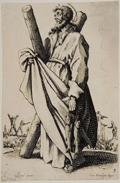 Editor: This small etching, "Saint Andrew" by Jacques Callot, depicts the saint with his cross and some fish. I'm really struck by the detail achieved in such a small format. What's your perspective on this work? Curator: Well, focusing on the material production, consider the copper plate Callot used and the labor involved in the etching process. How does this repeatable medium democratize the image of Saint Andrew, making it accessible beyond the elite? The fish, his attribute, now commodified. Editor: So, you're saying the printmaking process itself changes how we understand a religious figure like Saint Andrew? Curator: Precisely. It shifts the context from unique, revered object to a mass-produced commodity, circulated and consumed. It challenges the traditional, hierarchical notions of religious art, doesn't it? What do you think about the lines and their use? Editor: That's fascinating! It does make me rethink how the average person might have encountered religious imagery at the time. Curator: Indeed, it reveals so much about the social and economic currents shaping artistic production.
