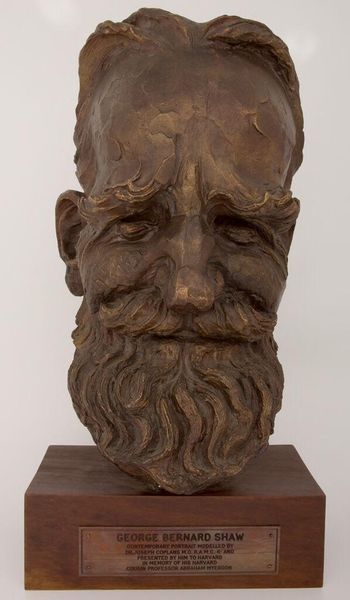 Curator: Before us stands Jacob Epstein's bronze "Bust of George Bernard Shaw," its powerful presence filling the gallery space. Editor: My first thought? Intensity! The sculpted features practically vibrate with Shaw's legendary intellect and sharp wit. Curator: Precisely. Epstein captures Shaw's essence through a masterful manipulation of texture and form. The roughness of the bronze lends a raw, almost confrontational quality. Editor: It's like he's ready to jump down and debate you. I can almost hear his booming voice. And those eyes—they seem to know everything. Curator: The artist emphasizes the play of light across the planes of the face, creating a dynamic interplay between shadow and illumination, truth and persona. Editor: I appreciate how Epstein didn't smooth everything out. You see the marks of the artist's hand, making it feel very alive, doesn't it? I feel like they were kindred spirits. Curator: A fittingly robust portrayal of a literary giant, I must say. Editor: Yeah. It makes you wonder what Shaw himself would have thought. He probably had something very witty to say about it.
