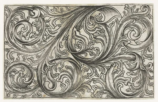 Editor: Here we have an anonymous engraving, probably a pen drawing from around 1500 to 1600, called "Fries met zowel links als rechts een dubbele voluut van bladranken," or "Frieze with double volutes of foliage tendrils on both left and right". It has a really interesting, almost repetitive quality. What are your thoughts when you see this kind of work? Curator: The immediate question for me is where this object would have been materially situated, and who would have owned it. The decorative nature speaks to consumption and display. Consider the labour involved in such detailed engraving during the Renaissance. This isn't just art; it's a commodity. Editor: A commodity? I hadn’t really considered that. The 'decorative' tag made me think of ornamentation of books or furniture... How does the engraving process factor in? Curator: Engraving was a highly skilled craft. The materials—metal plates, inks, and paper—were all subject to economic forces. Each print represents a transfer of artistic labor into a distributable, tradable object. Did this frieze serve an individual patron, or were these engravings available to wider markets to decorate different goods? What status did it imply to have your objects ornamented this way? Editor: So, understanding its original social context changes how we see the aesthetic value? Curator: Precisely. We tend to isolate art within galleries. But art is always embedded within broader systems of making and exchange. By focusing on process and material, we resist separating "high art" from "craft," recognizing them both as products of labour. Who profits from it, what materials make it, and how it is circulated is, to me, how meaning is created. Editor: That's fascinating, I see it as more than just decoration now. Thanks! Curator: And I understand the engraving’s decorative features not as mere aesthetic embellishment, but as material signs of social relations and productive forces!