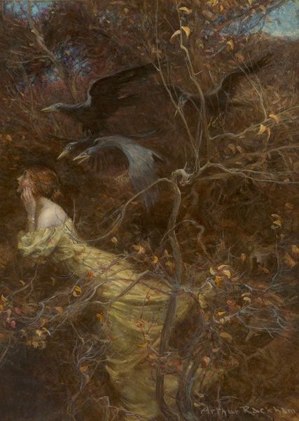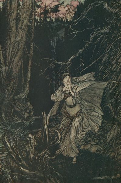 Arthur Rackham made this watercolor and ink illustration of Andromeda, choosing a very specific combination of these materials. He applies thin washes of translucent color, layered to create depth and shadow, rather than building up pigment, and the dark ink defines the figures and outlines the details. The way Rackham uses watercolor is particularly interesting because of its fluidity, blending and bleeding properties. It is difficult to control, and requires a certain level of skill to achieve precise results. In Andromeda, Rackham uses this unpredictability to his advantage, creating an atmosphere of mystery. The muted colors add to the sense of foreboding, and it's through his mastery of watercolor that Rackham can capture the drama of this mythological scene, where our heroine awaits her fate. Ultimately, by focusing on materials and processes, we can gain a deeper understanding of Rackham's artistic choices.