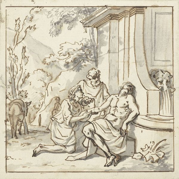 Curator: Welcome. Before us, we have "Erato, Muse of Lyric Poetry," an engraving by Noach van der Meer the Younger, dating somewhere between 1751 and 1822. It's currently held in the Rijksmuseum collection. Editor: It strikes me immediately as classically serene, although the density of the engraving gives it an almost unsettling feeling – a quiet disturbance. Curator: Yes, the hatching creates significant tonal variation. Note how Van der Meer employs linear precision to define Erato, her drapery, and the playful putti surrounding her. Consider, too, the deliberate construction of allegorical elements, a stylistic feature deeply embedded within Baroque art. Editor: I find myself more intrigued by the tangible aspect. I am curious about the paper itself – the source, the quality. An engraving like this demanded skill, of course, but what about the lives of those who made the paper? What kind of labor produced it? Its texture and weight speak to something beyond the pure aesthetics. Curator: An interesting point. The engraving style itself has a semantic dimension, though; it evokes a sense of history and permanence through its very meticulousness. The allegorical scene—Erato with her lyre, surrounded by playful putti, each holding musical scores and medallions—resonates with Neoclassical ideals about artistic patronage. Editor: Agreed. But the materiality suggests that the art was also a commodity. Paper in that era represented resources, trade, the colonial endeavors that shaped it. The crisp lines you mention owe their existence to materials extracted, manufactured, and traded. Curator: A valid interpretation. From a formal perspective, one might argue the contrast between the crisp figure of Erato and the surrounding trees leads the eye, structuring a clear visual hierarchy and reinforces the narrative. Editor: For me, thinking about the work, I also feel compelled to think about what became of the paper—whether it held significance for ordinary people or only existed within rarefied circles of high art. Curator: Your emphasis on context is noted. The composition remains paramount, the subtle gradation of tone imbuing Erato's figure with a striking sense of grace and classical elegance. Editor: It really compels you to look closer once you think of that social side, the other half of art making. I appreciate both approaches. Curator: Indeed, each adds a layer to our comprehension of this exquisite print. Thank you for your illuminating observations.